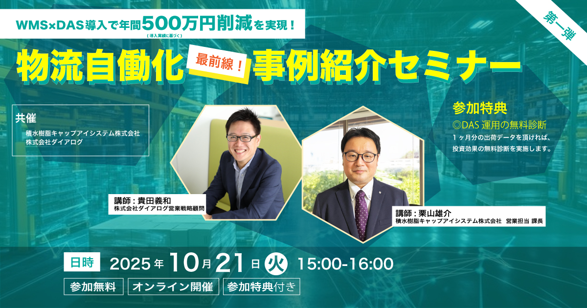 本セミナーでは、WMS(倉庫管理ITシステム)とマテハン自動機械の連携による「全体最適」をベースとした高付加価値創出実現を主テーマに、物流DXを成功に導く具体的な手法を事例を解説します。WMSベンダーであるダイアログと、DAS(デジタルアソートシステム)メーカーの積水樹脂キャップアイシステムが、それぞれの専門的知見と協業による実例を交えてご紹介します。特に、食品物流における出荷作業において、生産性を1.5倍に向上させる事例は必見です!